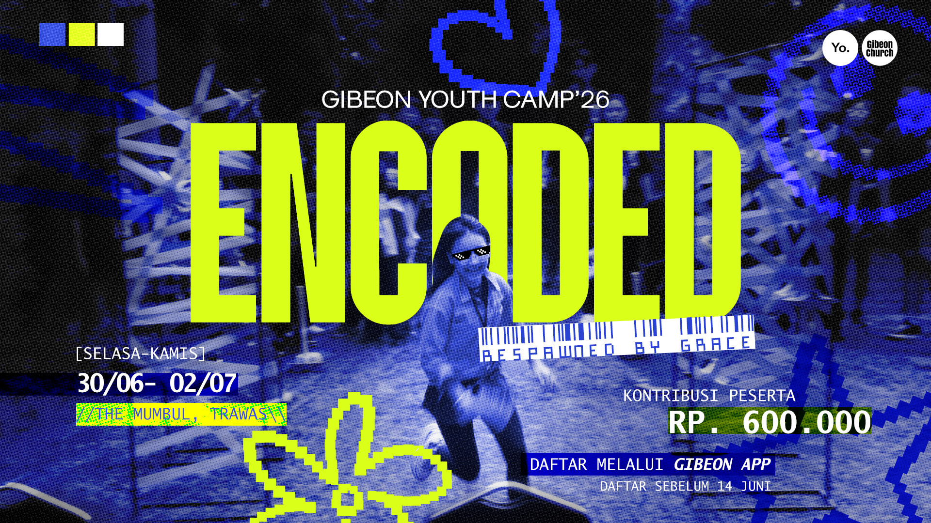 Hi Youth! Khusus buat kamu yang duduk di kelas 6 SD - SMA, ini adalah Form Pendaftaran Gibeon Youth Summer Camp 2026 yang bertema ENCODED: Respawned by Grace. Acara ini akan diadakan pada :